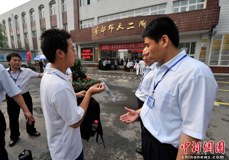2010年全國高考6月7日日拉開大幕,957萬考生走進(jìn)考場。由于報名人數(shù)減少,而招生計劃增加,教育部預(yù)計今年全國高考平均錄取率將會增加近7%。圖為首都師范大學(xué)第二附屬中學(xué)考點。中新網(wǎng)記者 金碩 攝