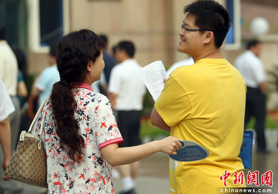 2010年全國高考6月7日日拉開大幕,957萬考生走進(jìn)考場。由于報名人數(shù)減少,而招生計劃增加,教育部預(yù)計今年全國高考平均錄取率將會增加近7%。圖為母親為兒子扇風(fēng)降溫。中新社發(fā) 蘇丹 攝