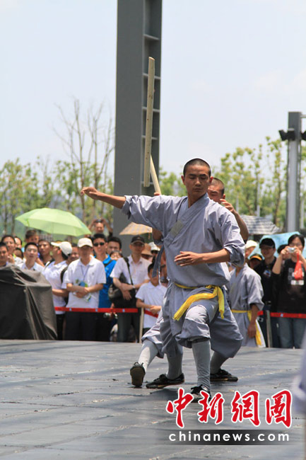 自5月1日開始,上海世博園D片區(qū)綜藝廣場(chǎng)每天都有少林寺功夫展演,受到世博參觀者的熱捧。中新社記者 殷春永攝