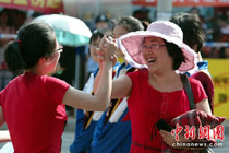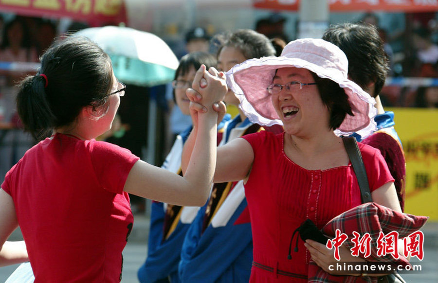6月7日,為期兩天的2010年普通高等學(xué)校招生全國統(tǒng)一考試開考,全國將有957萬考生走進(jìn)考場。圖為高考第一天,遼寧丹東一中考場外的老師鼓勵準(zhǔn)備參加考試的學(xué)生獲得好成績。陳浩 攝