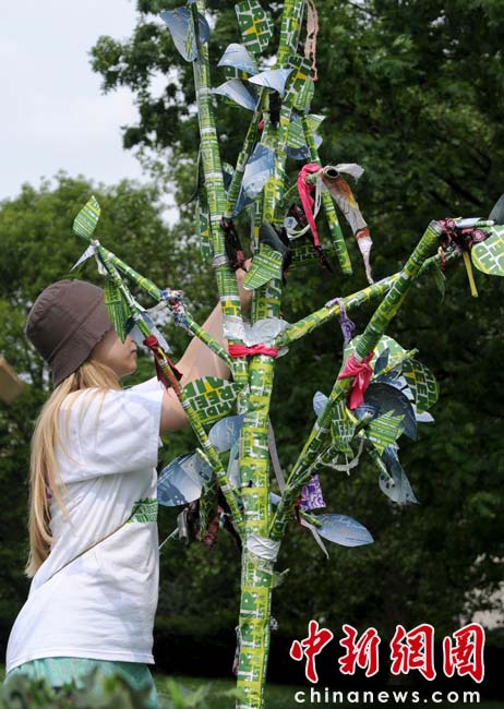 當(dāng)?shù)貢r(shí)間2010年6月6日,英國倫敦舉行卡姆登綠色市集(Camden Green Fair),這是英國倫敦每年環(huán)保領(lǐng)域的“重頭戲”。本屆市集的主旨是要喚起大眾對環(huán)境問題的關(guān)注,選擇更加可持續(xù)發(fā)展的生活方式。據(jù)活動(dòng)主辦方預(yù)計(jì),本屆市集將吸引來自英國各地和世界各國的2萬多人參加。圖為用回收的廢舊紙張制作的“小樹”。該樹由年輕的倫敦園藝設(shè)計(jì)師Sarah Veniard設(shè)計(jì)。她的設(shè)計(jì)理念是“美麗的可持續(xù)空間”。她認(rèn)為只要有充足的陽光,陽臺(tái)也可以變成一個(gè)集水果蔬菜和觀賞植物于一身的多功能花園。Sarah是純素食主義者,她結(jié)合顧客要求設(shè)計(jì)的瓜果園非常受歡迎。Fiona/攝 Fiona 馬小剛/文