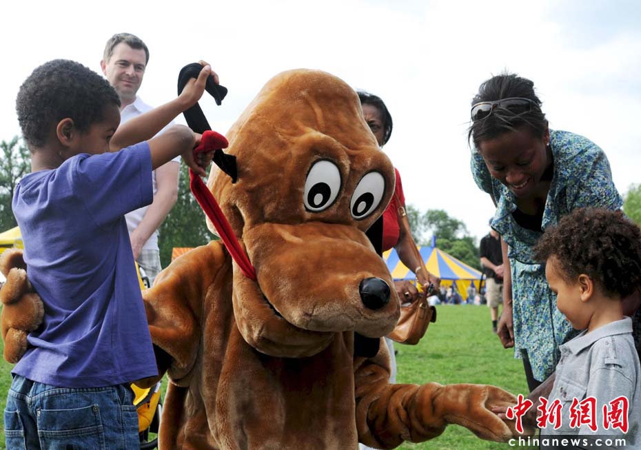 當(dāng)?shù)貢r(shí)間2010年6月6日,英國倫敦舉行卡姆登綠色市集(Camden Green Fair),這是英國倫敦每年環(huán)保領(lǐng)域的“重頭戲”。本屆市集的主旨是要喚起大眾對環(huán)境問題的關(guān)注,選擇更加可持續(xù)發(fā)展的生活方式。據(jù)活動主辦方預(yù)計(jì),本屆市集將吸引來自英國各地和世界各國的2萬多人參加。圖為由工作人員扮成的卡通狗總會引來許多孩子。Fiona/攝 Fiona 馬小剛/文