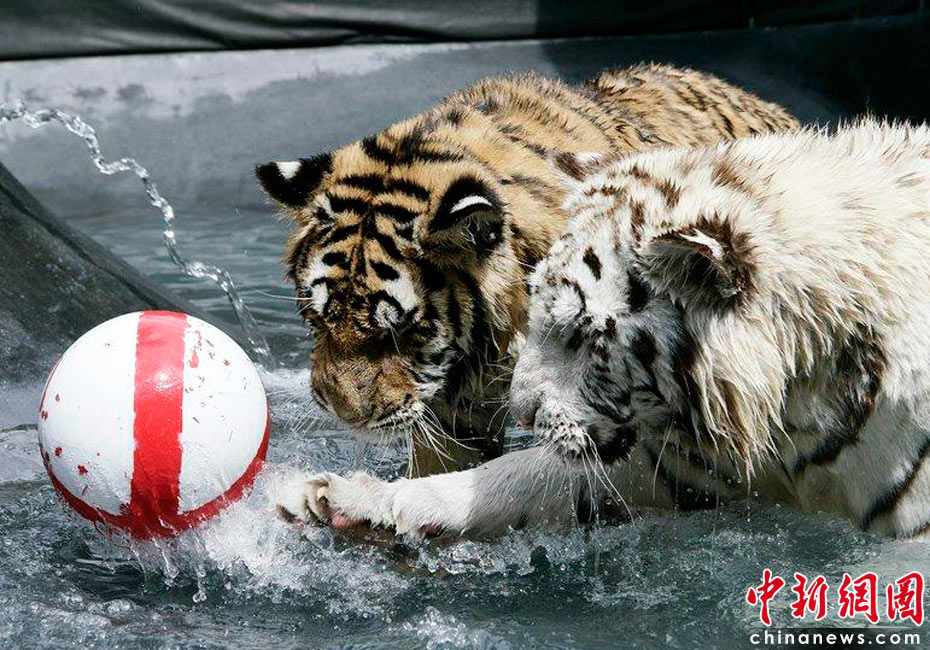 2010年6月7日,美國南卡羅來納州美特爾海灘,在世界杯即將開幕之際,一歲的小白虎Sundaram和孟加拉虎Mukti率先在水里上演了一出足球大戲。英格蘭隊首戰(zhàn)將對陣美國隊,因此足球外側(cè)也被印上了英格蘭旗的標(biāo)志。cfp