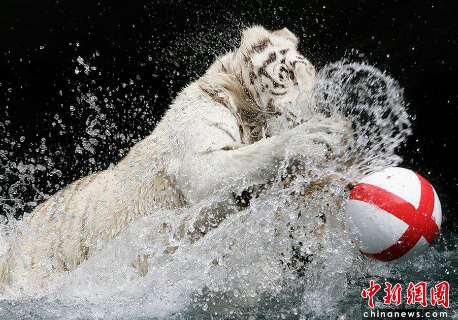 2010年6月7日,美國南卡羅來納州美特爾海灘,在世界杯即將開幕之際,一歲的小白虎Sundaram和孟加拉虎Mukti率先在水里上演了一出足球大戲。英格蘭隊首戰(zhàn)將對陣美國隊,因此足球外側也被印上了英格蘭旗的標志。cfp
