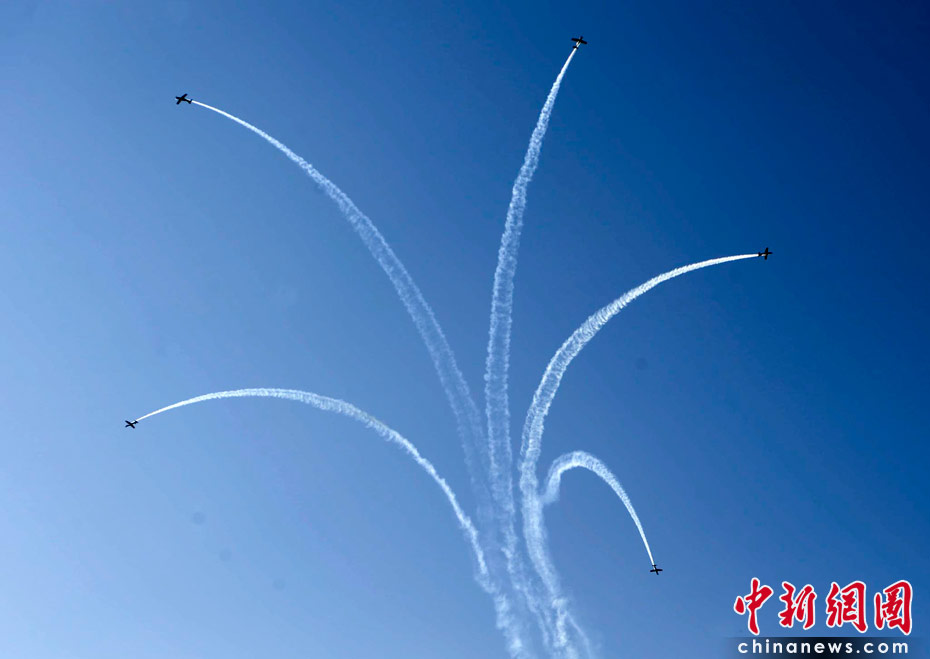 當(dāng)?shù)貢r間6月9日,南非約翰內(nèi)斯堡足球城,飛行表演隊在進行演練。中新社發(fā) 廖攀 攝