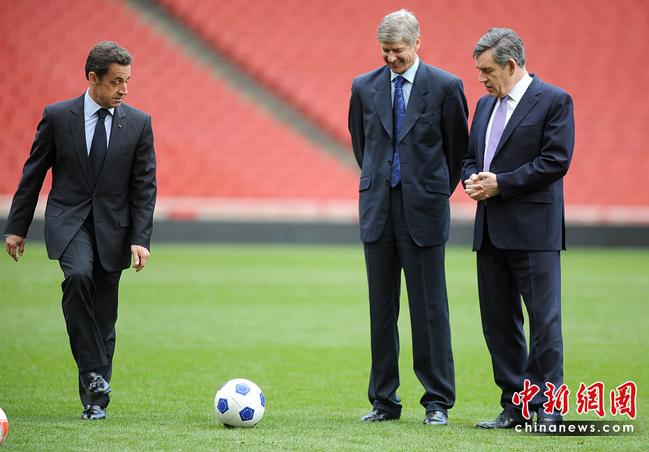圖為2008年3月27日,法國(guó)總統(tǒng)薩科齊來(lái)到倫敦酋長(zhǎng)球場(chǎng),在英國(guó)首相布朗和英超勁旅阿森納隊(duì)主教練溫格面前“秀”了一下腳法。