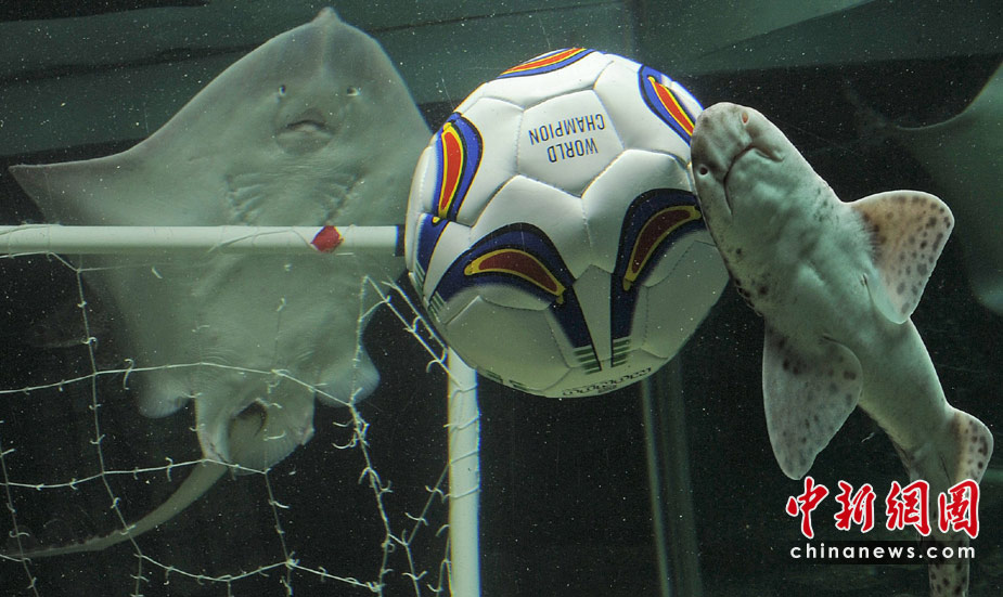 當?shù)貢r間6月15日,德國北部,水族館里的海洋生物爭搶填滿飼料的足球。