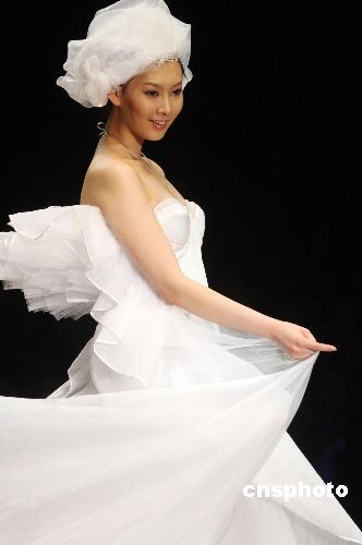 11月7日,“名瑞杯”2008中國(guó)婚紗設(shè)計(jì)大賽在北京中國(guó)國(guó)際時(shí)裝周上舉行,共有來(lái)自中國(guó)14個(gè)地區(qū)的25份稿件入圍了最后的決賽。參賽作品類(lèi)型設(shè)計(jì)多樣化,有顏色和造型都很獨(dú)特的禮服,也有哥特式風(fēng)格的新娘裝等,作品設(shè)計(jì)大膽新穎,使用夸張的造型,同時(shí)運(yùn)用以點(diǎn)堆積成面的裝飾手法,在裙身上做出圖案或者肌理,來(lái)豐富服裝的整體內(nèi)容,F(xiàn)在的婚紗已經(jīng)不是婚禮的附屬品,而是慢慢的成為時(shí)尚亮點(diǎn),新娘通過(guò)選擇婚紗來(lái)體現(xiàn)自己的個(gè)性和心情,婚紗成為一種特殊的媒介。圖為模特展示婚紗設(shè)計(jì)大賽作品。中新社發(fā) 錢(qián)興強(qiáng) 攝
