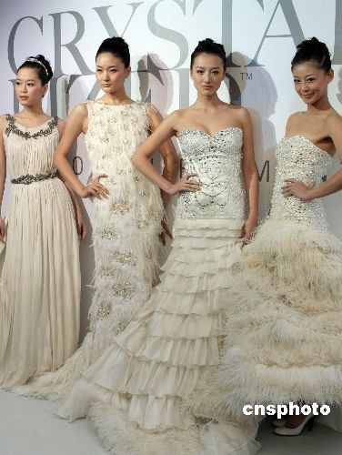 11月18日,一場時尚婚禮匯展在上海舉行,耀眼奪目的水晶婚紗禮服吸引了不少參觀者的“眼球”。圖為模特展示水晶婚紗禮服。中新社發(fā) 湯彥俊 攝