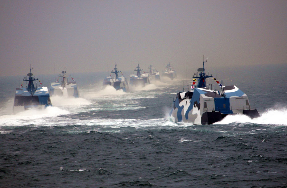 4月23日下午,為紀念中國人民解放軍海軍成立60周年而舉行的海上閱兵在青島附近黃海海域舉行。海上檢閱式分兩個階段,第一階段為海上分列式,檢閱中國海軍的艦艇和飛機;第二階段為海上閱兵式,檢閱來自14個國家的21艘艦艇。圖為中國海軍新型導彈快艇編隊接受檢閱。 中新社發(fā) 張雷 攝