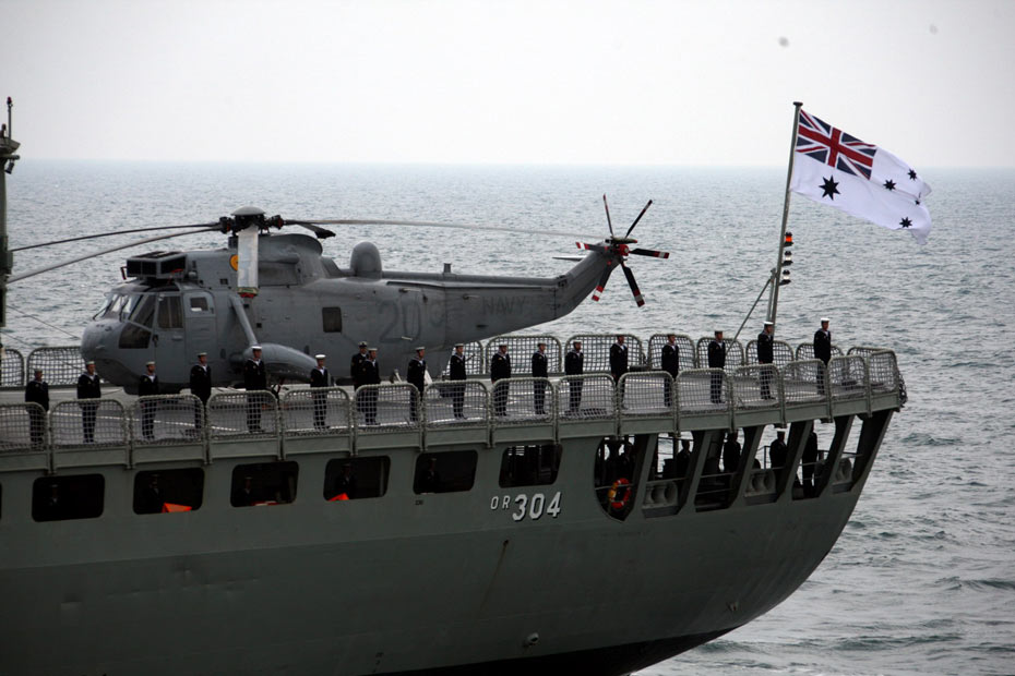 中國歷史上的首次多國海軍檢閱活動(dòng)四月二十三日下午在青島附近黃海海域舉行。中國國家主席、中央軍委主席胡錦濤乘閱兵艦“石家莊”號導(dǎo)彈驅(qū)逐艦,檢閱中國海軍的潛艇、水面艦艇、海軍航空兵和海軍陸戰(zhàn)隊(duì)等作戰(zhàn)兵種,并檢閱了來訪的十四個(gè)國家的二十一艘艦艇。圖為參加檢閱的外國軍艦。中新社發(fā) 張雷 攝