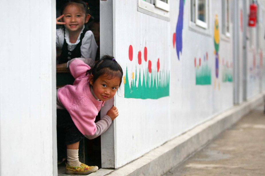 5月11日,小學(xué)生在板房搭建的學(xué)校里嬉戲。四川省綿陽市安縣在去年大地震中受災(zāi)嚴(yán)重,目前全縣規(guī)劃恢復(fù)重建學(xué)校49所,包括高中、職業(yè)中學(xué)、初中、小學(xué)等,規(guī)劃總建筑面積38萬多平方米。中新社發(fā) 富田 攝