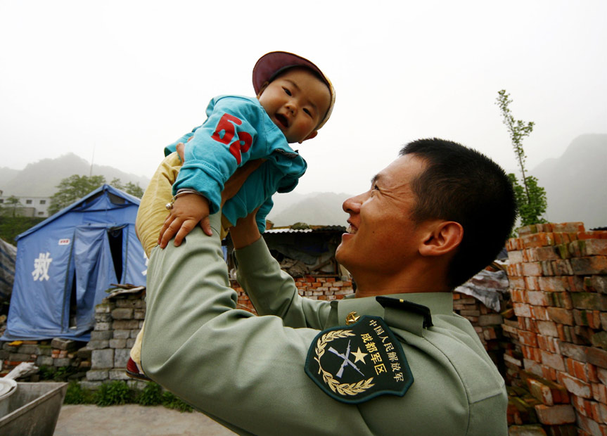2009年4月下旬,解放軍官兵回到08年地震參加救援的重災(zāi)區(qū)什邡市鎣華鎮(zhèn)、紅白真鎮(zhèn)、洛水鎮(zhèn),看望慰問當(dāng)?shù)厝罕,祭奠遇難者。 中新社發(fā) 鐘 敏 攝
