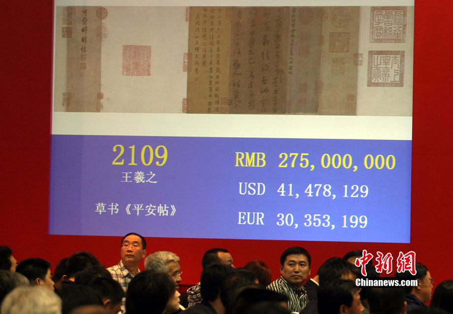 11月20日晚,在中國嘉德2010秋季拍賣會“秋光萬華——清代宮廷藝術(shù)集粹”專場中,王羲之草書《平安帖》以人民幣三億零八百萬成交。中新社 楊可佳 攝