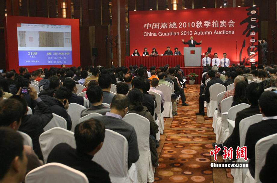 11月20日晚,在中國嘉德2010秋季拍賣會“秋光萬華——清代宮廷藝術集粹”專場中,王羲之草書《平安帖》以人民幣三億零八百萬成交。中新社 蘇丹 攝