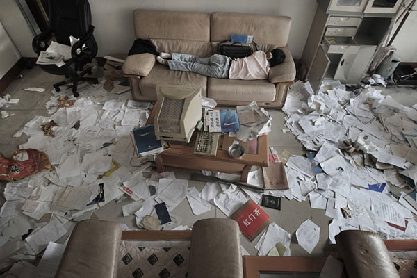 2008年10月14日,一位催討債務(wù)的男子在江龍集團(tuán)銷售辦公室睡覺(jué)。受全球金融海嘯影響,國(guó)內(nèi)最大的印染企業(yè)江龍集團(tuán)資金鏈斷裂,企業(yè)老板出逃,大批債權(quán)人來(lái)到集團(tuán)總部討債。作者:傅擁軍 中國(guó)