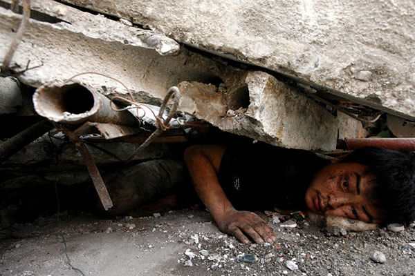 2008年5月15日,在四川省北川縣城的廢墟下,26歲的男子陳堅(jiān)在等待援救。晚上8時(shí),經(jīng)過7個(gè)鐘頭的營救他被救出,但由于傷勢(shì)嚴(yán)重沒能活下來。作者:郭鐵流 中國