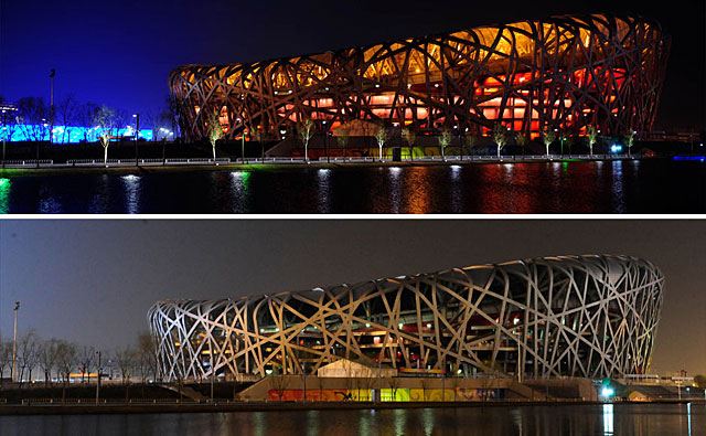 中國北京。3月28日,熄燈前后的國家體育場“鳥巢”。