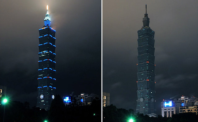 中國臺北。3月28日,熄燈前和熄燈后的臺北101大樓。