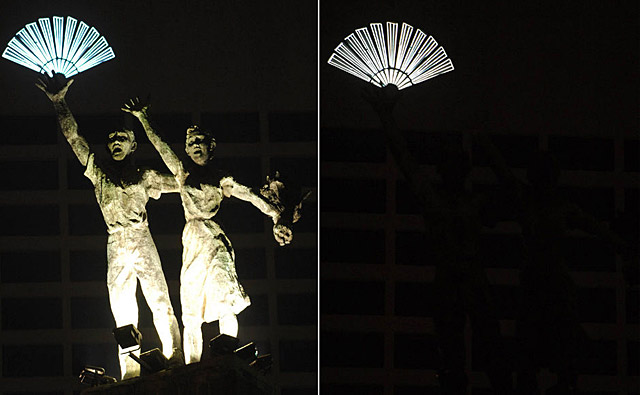 印度尼西亞雅加達(dá):3月28日,印度尼西亞首都雅加達(dá)的印尼環(huán)形廣場雕塑在參與“地球一小時”熄燈行動前(左)和熄燈后(右)的對比情況。