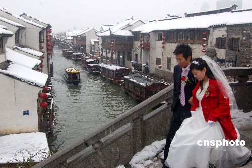 圖為一對新人前往古街山塘拍攝雪景留念。