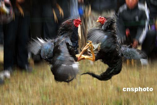 2月8日,大年初二,安徽淮北市童亭礦工會舉辦了一場斗雞比賽。10多對體型高大,魁梧強健,性情兇猛的斗雞,面對對手個個針鋒相對,動作敏捷,嘴腿并用,重爪烈翅,騰閃擊打。據(jù)了解,斗雞是我國古老的玩賞型雞種,有著數(shù)千年歷史,斗雞場面激烈緊張,極富刺激性和觀賞性。中新社發(fā) 胡珍玲(安徽) 攝