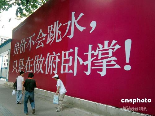 圖為房地產(chǎn)開(kāi)發(fā)商在南京街頭打出的廣告牌。最近網(wǎng)絡(luò)上流行“我是出來(lái)做俯臥撐的”這句話(huà),而南京某開(kāi)放商也想借機(jī)炒作一把,在南京新街口附近立起一塊廣告牌“房?jī)r(jià)不會(huì)跳水,只是在做俯臥撐”。中新社發(fā) willis84 攝