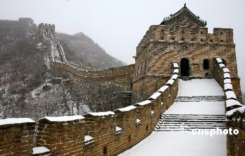 12月10日,北京慕田峪長(zhǎng)城初雪景色。當(dāng)日,北京下了冬季第一場(chǎng)雪,紛飛的雪花灑落在長(zhǎng)城上,宛若一條銀白色的長(zhǎng)龍,給游客帶來(lái)了驚喜。中新社發(fā) 卜向東 攝