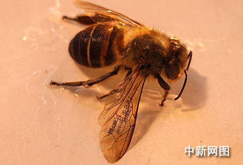 臺灣著名微雕家陳逢顯最近在一只蜜蜂標(biāo)本的翅膀上寫下了金庸武俠小說《神雕俠侶》中的一句話“過兒吾愛,我在絕情谷底,小龍女筆”十四個微小字。圖為作品。中新社記者 陳立宇 攝