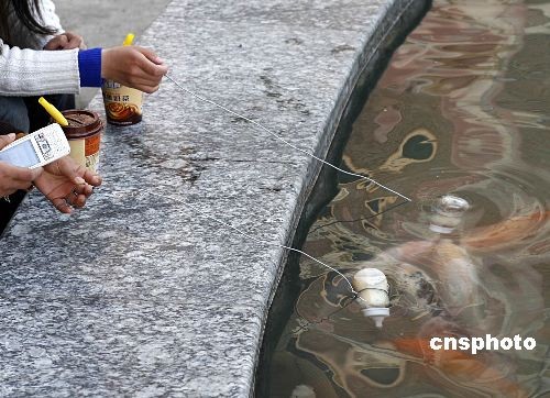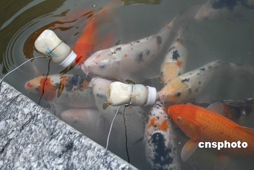 3月中旬,工作人員喂養(yǎng)“喝奶”的魚。在浙江東陽橫店影視城香港街景點(diǎn)內(nèi),養(yǎng)在水壇中的觀賞錦鯉是普通錦鯉與日本某錦鯉雜交后培育的品種,喂養(yǎng)它們則需要將飼料裝灌進(jìn)嬰幼兒奶瓶中,該飼料的顏色如“乳奶”一般,然后將奶瓶用鐵絲系住放入水中,隨后,這些魚兒就會(huì)圍攏過來,爭搶著用奶嘴吸“奶”喝了。