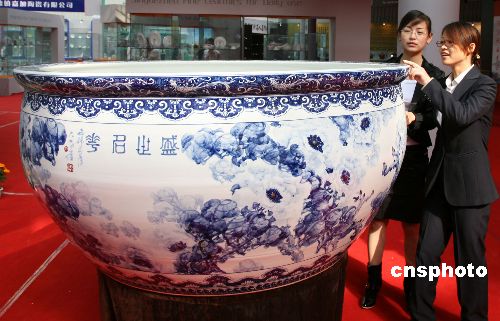 10月18日,2007景德鎮(zhèn)國(guó)際陶瓷博覽會(huì)開(kāi)幕。圖為一款名為“盛世名花”的青花釉巨型瓷缸引起觀眾的好奇。這口大缸由景德鎮(zhèn)技師余鵬飛手工拉坯、畫(huà)家崔廷玉繪制、經(jīng)1300攝氏度高溫?zé)贫,缸口直?.66米,高0.82米,這是當(dāng)今世界已知最大的一個(gè)青花釉瓷缸。中新社發(fā) 吳慶才 攝