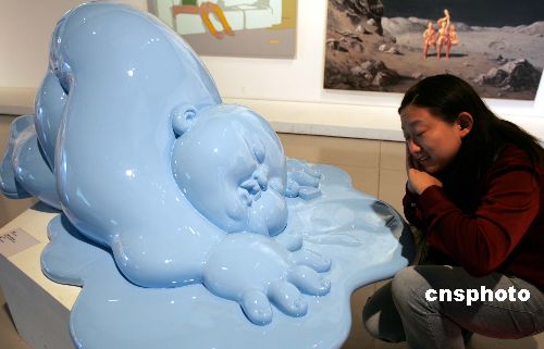正在上海舉行的動漫美學雙年展有許多作品趣味逗人,一名觀眾在《睡著了》作品旁做模仿狀。據(jù)悉,參展的近百件作品來自意大利、美國、中國大陸和臺灣地區(qū)。中新社發(fā) 潘索菲 攝