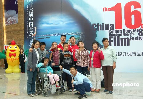 10月26日,蘇州市平江區(qū)培智學(xué)校組織近百名殘疾兒童到蘇州“鳥(niǎo)巢”——科技文化中心,感受正在舉行的第十六屆中國(guó)金雞百花電影節(jié)。圖為殘疾兒童在老師的陪同下高興地在電影節(jié)吉祥物前合影留念。中新社發(fā) 邱勇 攝