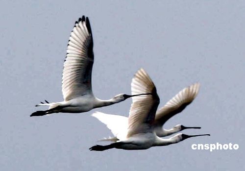 十一月四日,在福建福清市江鏡濕地上,四十多只黑臉琵鷺來到這里過冬。黑臉琵鷺為候鳥,是國際極度瀕危物種,現(xiàn)在全球只剩一千只左右,國際自然資源物種保護(hù)聯(lián)盟和國際鳥類保護(hù)委員會都將其列入瀕危物種紅皮書中,成為僅次于朱瀗的第二種最瀕危水禽。此外,還有二百多只黑嘴鷗、四千多只黑腹濱鷸、二百多普通鸕鶿等大量珍稀鳥類棲息于此。中新社發(fā) 楊婀娜 攝