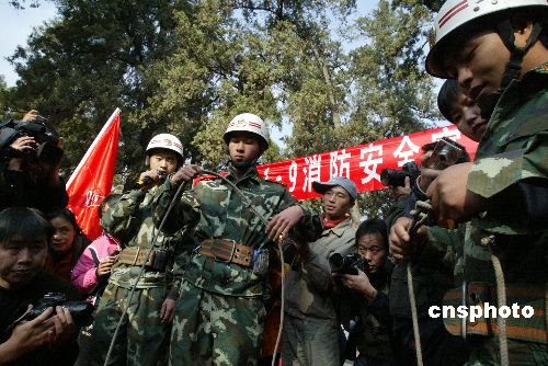 11月4日,河南省消防總隊(duì)和嵩山少林寺聯(lián)合在少林寺門前廣場舉辦以“生命至上,平安和諧”為主題的大型消防安全宣傳活動。通過現(xiàn)場滅火演練、消防知識講解等形式,引導(dǎo)公眾關(guān)愛生命,加強(qiáng)防火意識。中新社發(fā) 楊賀偉 攝