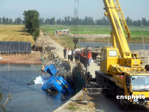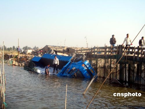 11月7日早晨5時許,一輛大貨車行駛至浙江溫嶺箬橫鎮(zhèn)西浦村新塘橋時,壓斷小橋后貨、車和人一起翻入河里,幸好河水不深,駕駛室內(nèi)3人從車窗爬出逃生。據(jù)了解,此橋是該市十幾年前修筑東浦海塘?xí)r,為方便小型載貨車運(yùn)送石料而修筑,多年來該橋只能承受小貨車同行,且橋面已有多處開裂。據(jù)悉,肇事車輛車身重8000公斤,加上載貨5000多公斤,共計13000公斤。中新社發(fā) 林貽高 攝