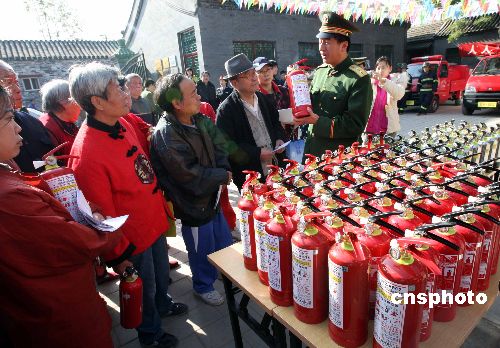 十一月八日,“11.9”消防宣傳日前夕,北京西城消防官兵來到屬地的社區(qū),為民眾發(fā)放滅火器并現(xiàn)場(chǎng)演示滅火器的使用方法,宣傳家庭中火災(zāi)的撲救等常識(shí),提高市民的防范意識(shí)。中新社發(fā) 任海霞 攝