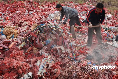 11月8日,重慶市云陽(yáng)縣集中銷毀了620萬(wàn)響非法生產(chǎn)和經(jīng)營(yíng)的煙花爆竹,消除了安全隱患。這些煙花爆竹是該縣在全國(guó)消防安全日前夕,對(duì)全縣43個(gè)鄉(xiāng)鎮(zhèn)進(jìn)行排查時(shí)收繳的。中新社發(fā) 劉小洋 攝