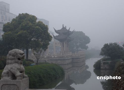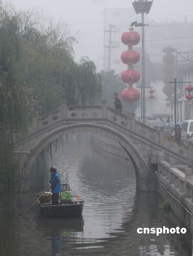 11月9日早晨,古城蘇州被入冬以來的首場濃霧所籠罩,市區(qū)部分路段能見度不足百米。 頗具江南特色的街坊建筑及小橋流水在霧中若隱若現(xiàn),別有一番風(fēng)味。中新社發(fā) 王建康 攝