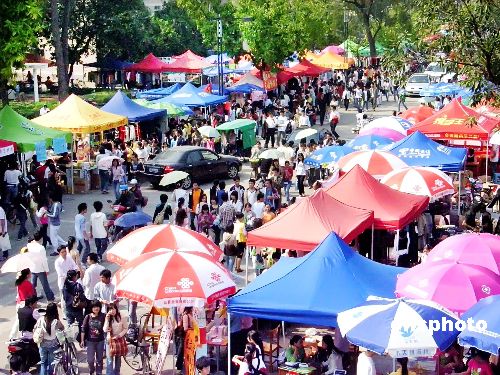 2007年11月9-10日,廣西大學(xué)一年一度的校園運動會舉行。每年的運動會期間,學(xué)生們都主動到社會拉商家贊助,只要商家贊助,學(xué)校就允許商家在運動會現(xiàn)場周邊擺攤經(jīng)營。今年商家的進(jìn)入達(dá)到高峰,校園主干道密密麻麻地擺滿了小攤,人頭涌動,車水馬龍,整個校園就像一個露天大超市。中新社發(fā) 駱文剛 攝