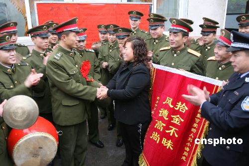 11月15日,河南省新鄉(xiāng)華爾惠燈飾有限公司總經(jīng)理趙明惠帶著錦旗驅(qū)車找到濟(jì)南軍區(qū)某炮兵團(tuán)士官劉小濤,向他表示感謝。劉小濤幾天前將趙明惠丟失的6萬(wàn)元現(xiàn)金及時(shí)交給派出所。中新社發(fā) 唐金江 攝