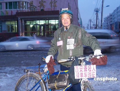 11月28日,來自陜西西安的一位頭發(fā)花白、精神矍鑠的聾啞老人唐應(yīng)成騎著單車抵達(dá)黑河市福蘭賓館附近。為了完成自己“走遍全中國,宣傳2008年北京奧運(yùn)會(huì),成為全國聾啞第一人”的夢(mèng)想,從1997年4月5日開始,在家人的全力支持下,62歲的西安聾啞老人唐應(yīng)成騎單車,先后沿四川、云南、湖北、湖南、廣東、海南、廣西、新疆、山西、內(nèi)蒙古一路走了下來,經(jīng)過長達(dá)十年零三個(gè)月的艱苦跋涉,已經(jīng)走過了全國27個(gè)省、市、自治區(qū),行程42萬多公里,以自己獨(dú)特的方式,表達(dá)了一個(gè)普通公民對(duì)北京2008年奧運(yùn)會(huì)的支持。經(jīng)過與老人用紙和筆的采訪和溝通,老人從隨行的包裹中拿出許多各地對(duì)他的相關(guān)報(bào)道。唐應(yīng)成每到一地,除了收集當(dāng)?shù)厝罕婈P(guān)于申辦奧運(yùn)的祝福語、宣傳畫外,還用隨身攜帶的照相機(jī),拍下所到之處的風(fēng)土人情和自然風(fēng)光,匯集成簡單的畫冊(cè),作為遠(yuǎn)征的見證。