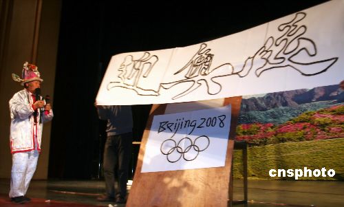 11月29日,遼寧沈陽鄭錫平在八一劇場北方老齡藝術(shù)團(tuán)5周年年慶會上,用自制的自來水毛筆表演“倒著一筆”分別寫完“2008北京奧運”、“五環(huán)”、“迎奧運”等,得到與會人員的贊嘆。