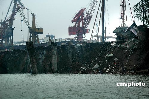 12月2日上午拍攝的坍塌現(xiàn)場(chǎng)圖片。12月1日晚,安徽省蕪湖市江東船廠岸邊,長(zhǎng)約90米7000多平方米的江堤突然坍塌,江東船廠10多間倉庫、一輛吊車及停在岸邊的一條躉船沉入水中。躉船上兩位值班的老人被一停留在岸邊的采砂船救起,事故造成近千萬元損失。目前,坍方現(xiàn)場(chǎng)得到控制。中新社發(fā) 老春 攝