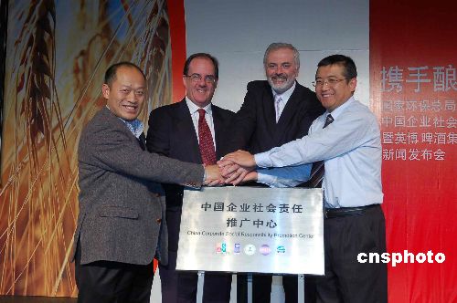12月5日,國家環(huán)保總局宣教中心與英國英博啤酒集團共同為中國企業(yè)社會責任推廣中心揭牌,同時,英博集團正式向該中心遞交其《二00七年企業(yè)公民責任報告》,由此成為歸檔該中心的第一家外資企業(yè)。中新社發(fā) 潘旭臨 攝