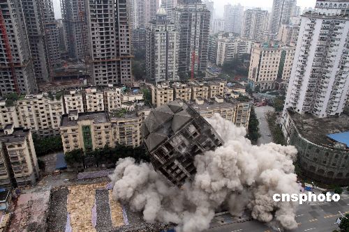12月6日15時,隨著一聲爆破聲起,位于重慶市主城鬧市的一棟25層、78米高的爛尾樓轟然倒下。該樓是中國西南地區(qū)到目前為止爆破拆除的最高大樓,也是重慶用爆破方式拆除的最大一座爛尾樓。中新社發(fā) 郭晉嘉 攝