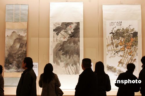 十二月十四日,中國(guó)畫壇三大巨匠張大千、劉海粟、朱屺瞻的作品在上!逗缈诰墶窌嬎囆g(shù)邀請(qǐng)展上同時(shí)亮相,吸引觀眾。三位大師都曾在上海虹口區(qū)生活過。與虹口區(qū)結(jié)緣的還包括魯迅、蔡元培、沈尹默、 豐子愷、李叔同等,這些文人墨客的百件重要真跡也同時(shí)展出。中新社發(fā) 潘索菲 攝