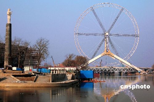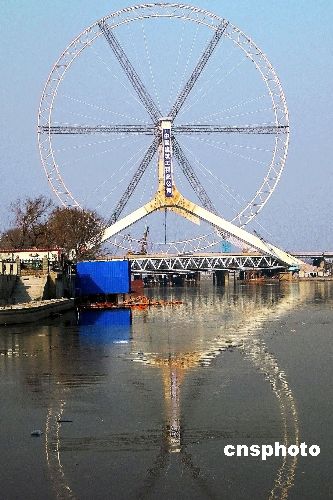 12月18日,位于天津三岔河口的重要景觀工程——“天津之眼”摩天輪輪盤安裝完畢,轉(zhuǎn)入負(fù)重測(cè)試和摩天輪座艙、電力驅(qū)動(dòng)裝置安裝階段!疤旖蛑邸 摩天輪直徑110米,其最高點(diǎn)距離地面約120米。輪盤外掛48個(gè)透明座艙,可供384人同時(shí)觀光,是名副其實(shí)的“天津之眼”。 中新社發(fā) 田齊 攝