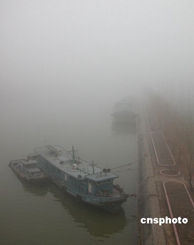 圖為濃霧彌漫下的大運河山東臺兒莊段。12月20日,大運河山東臺兒莊航段濃霧彌漫,能見度不足20米,到下午能見度不足百米,萬年船閘和臺兒莊船閘從今晨開始全線停止放船,濃霧給船隊通航和船民生活帶來不便。中新社發(fā) 高啟民 攝