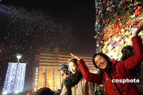 12月24日,北京西單街頭的一棵許愿樹前下起了“大雪”。這是商家為營造新年氣氛,利用造雪機(jī)給人們帶來的驚喜。不少年輕人一邊感受“雪天”的浪漫,一邊在貼紙上寫下祝福的話語掛在許愿樹上。中新社發(fā) 聞?wù)?攝